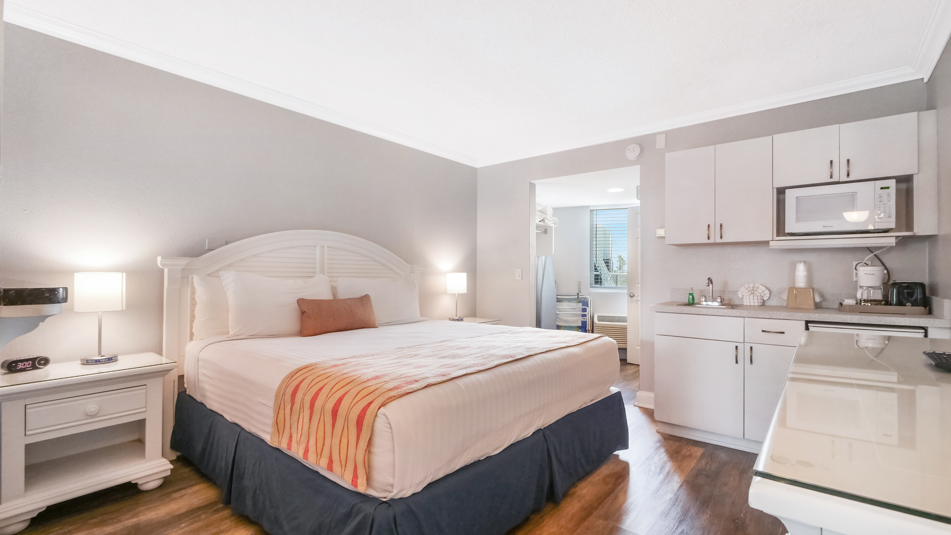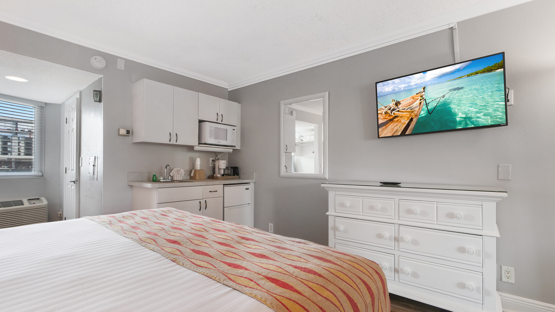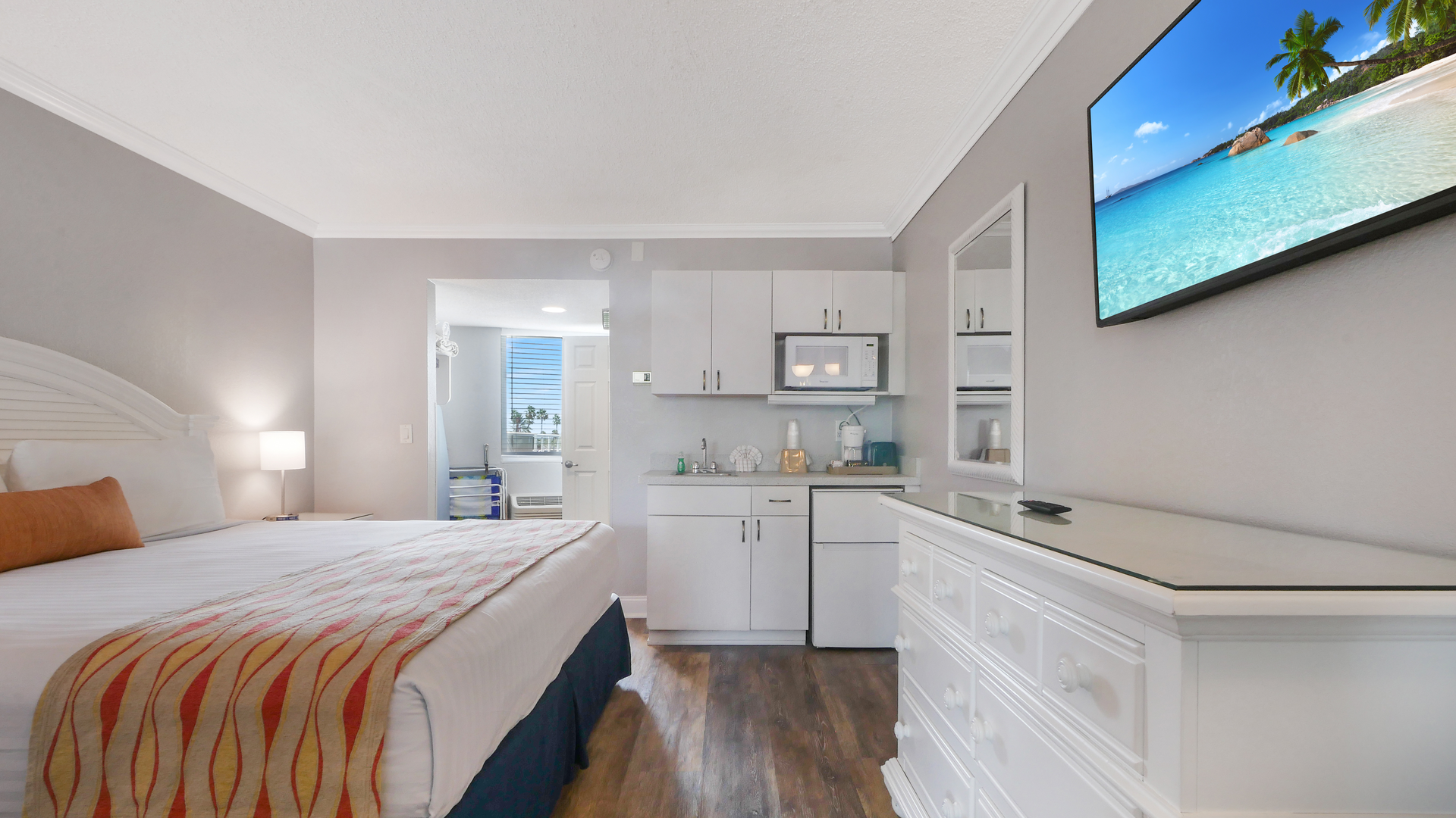 Inside, you'll find a convenient kitchenette with a mini-fridge, microwave, coffee maker, and toaster - perfect for preparing light meals and snacks. A dining table with two chairs and a flat-screen TV create a comfortable space to dine or unwind, while the private bathroom is stocked with fresh towels and toiletries. The perfect place to relax after a day in the sun!