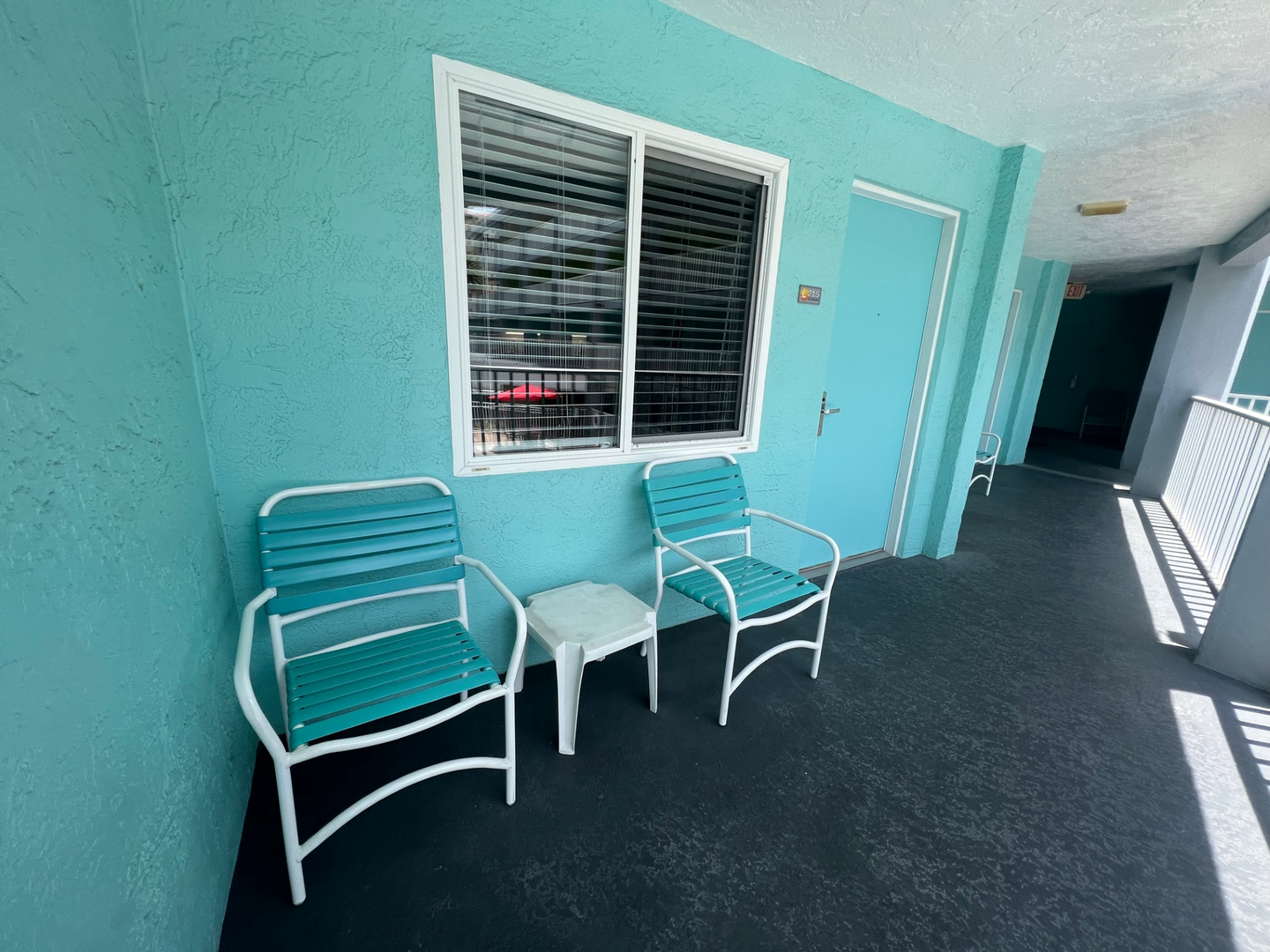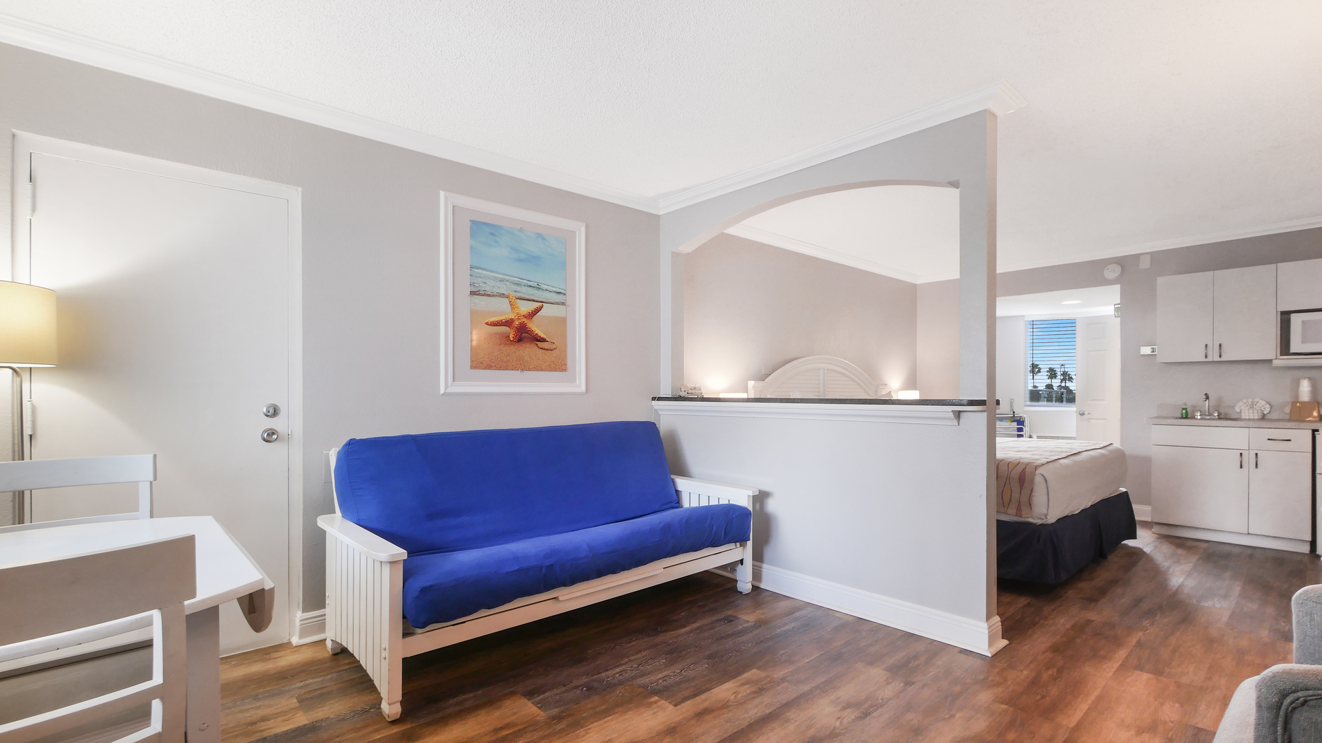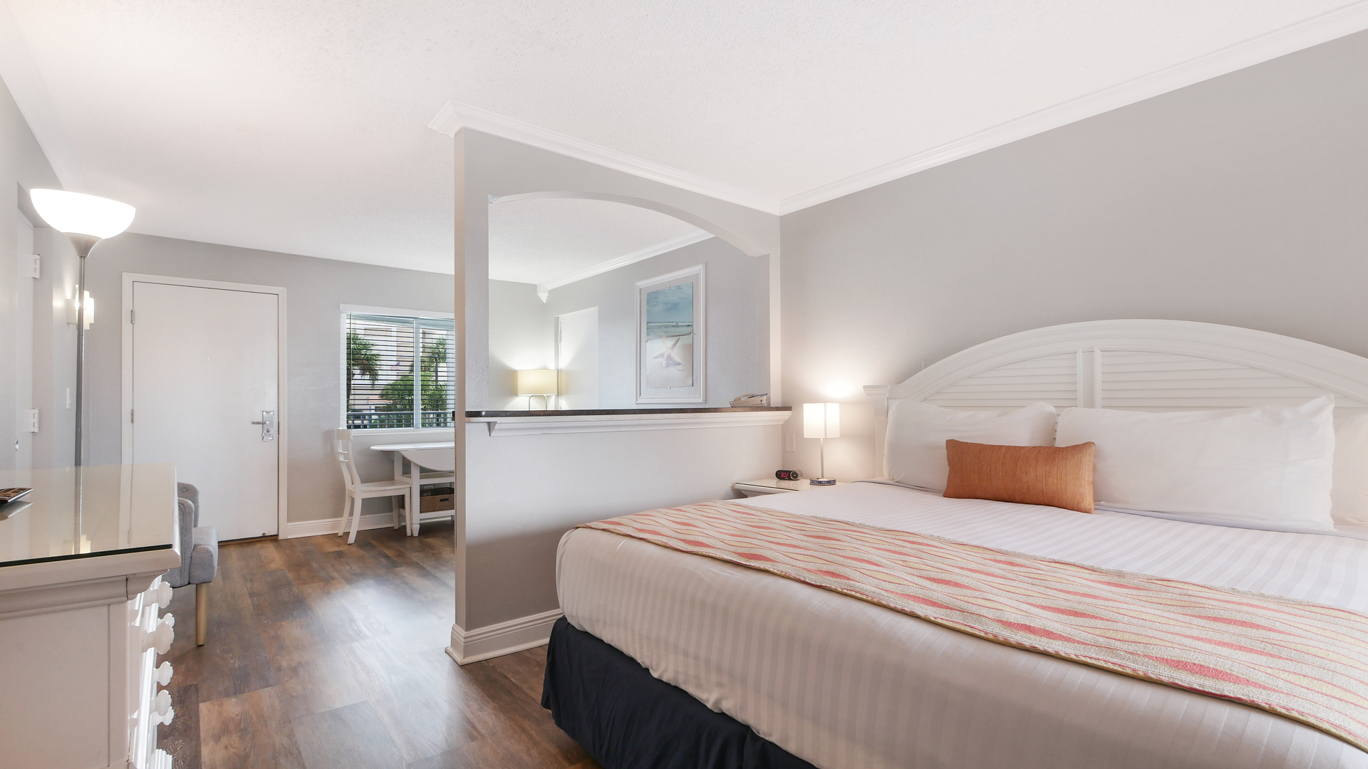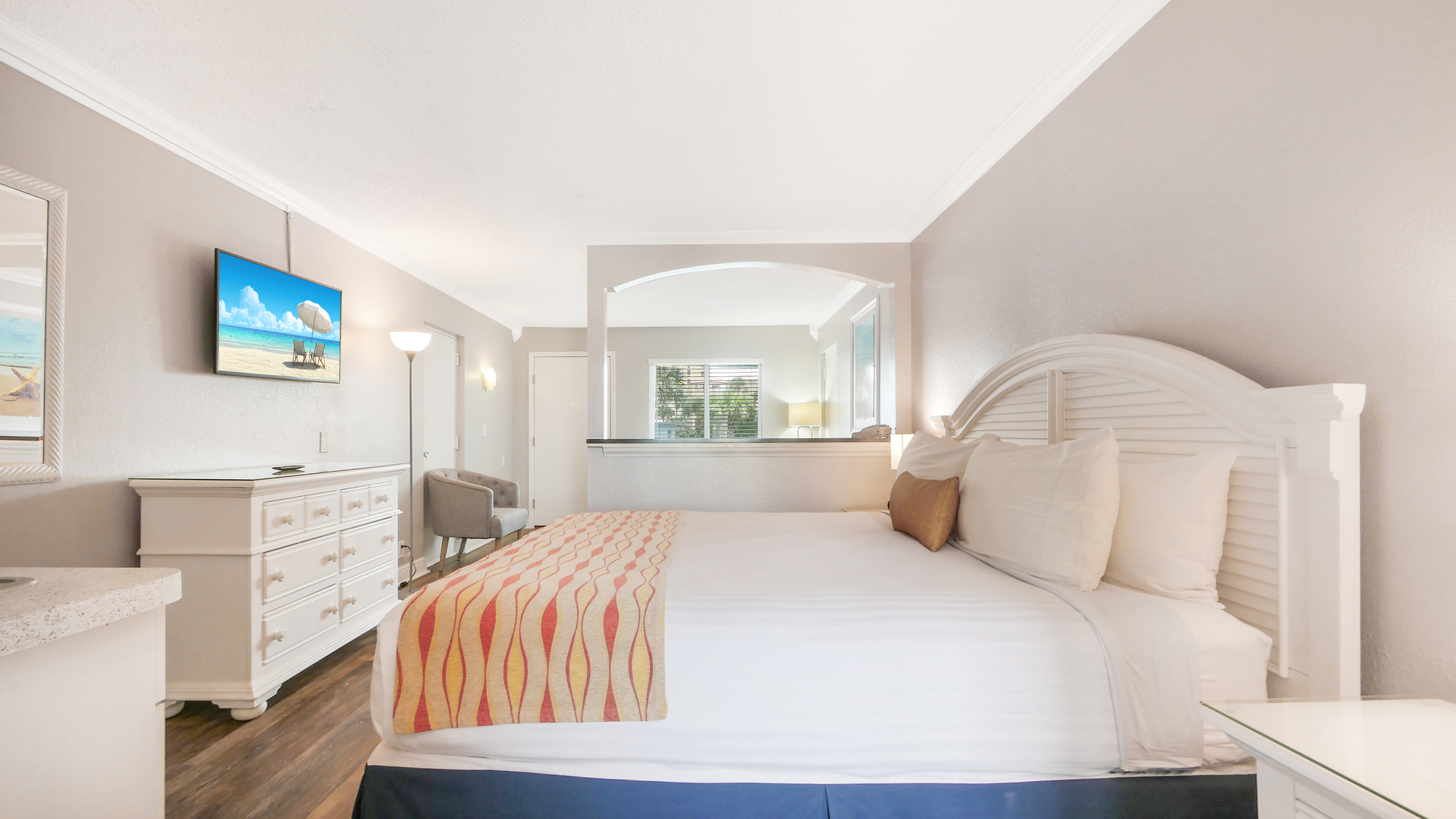Relax in this cozy 2nd-floor Standard unit with a pool view from the shared balcony. Perfect for couples or small families, it sleeps up to 4 with one king bed and a full-size sleeper futon.