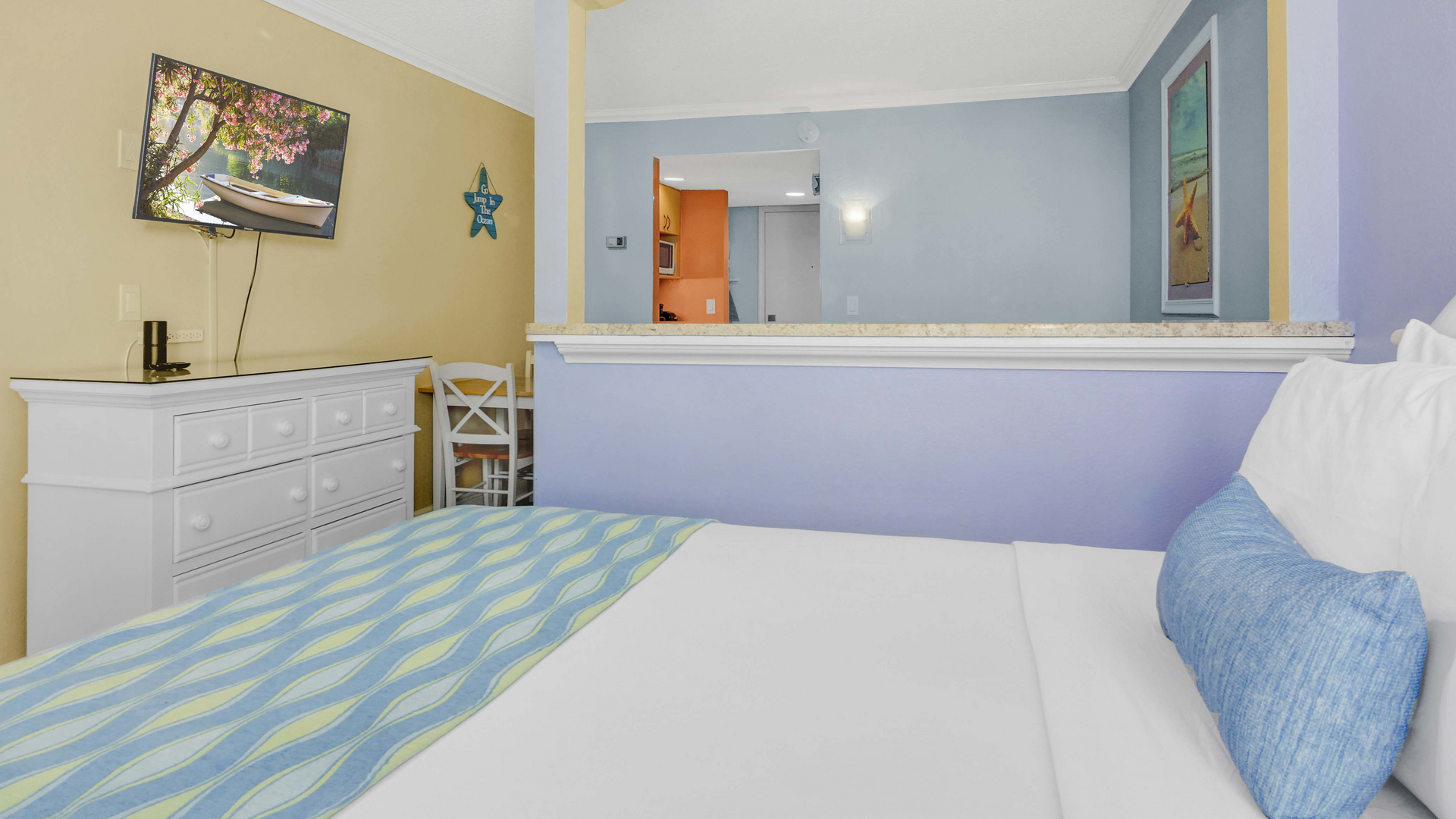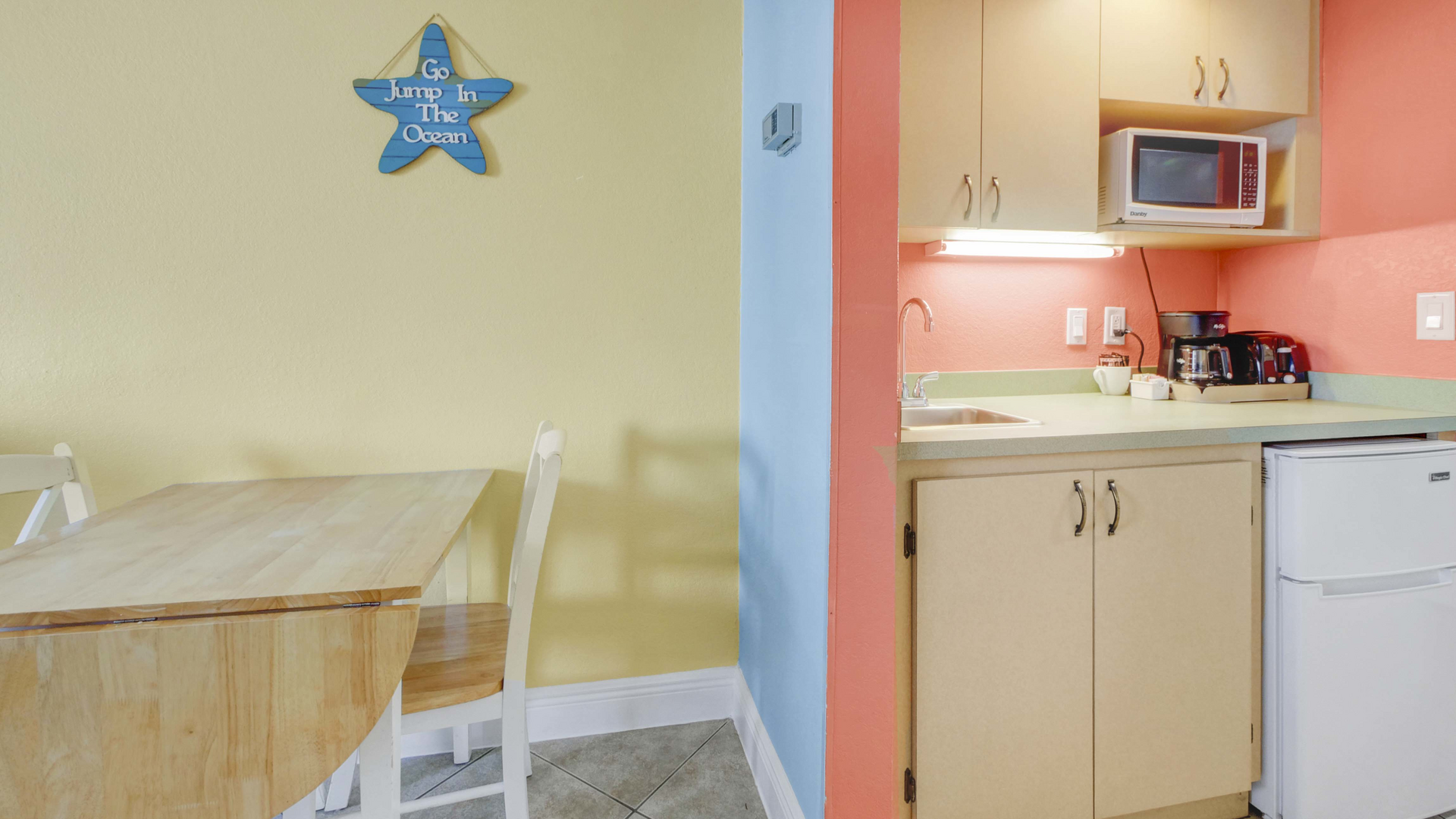 Nestled in the corner behind the elevator, this Studio offers a little extra privacy and a quieter stay compared to poolside rooms, while still keeping you just steps from the sugar-white sands of Clearwater Beach. Inside, you'll find a convenient kitchenette with a mini-fridge, microwave, coffee maker, and toaster - perfect for preparing light meals and snacks. A dining table with two chairs and a flat-screen TV create a comfortable space to dine or unwind, while the private bathroom is stocked with fresh towels and toiletries. The perfect place to relax after a day in the sun!