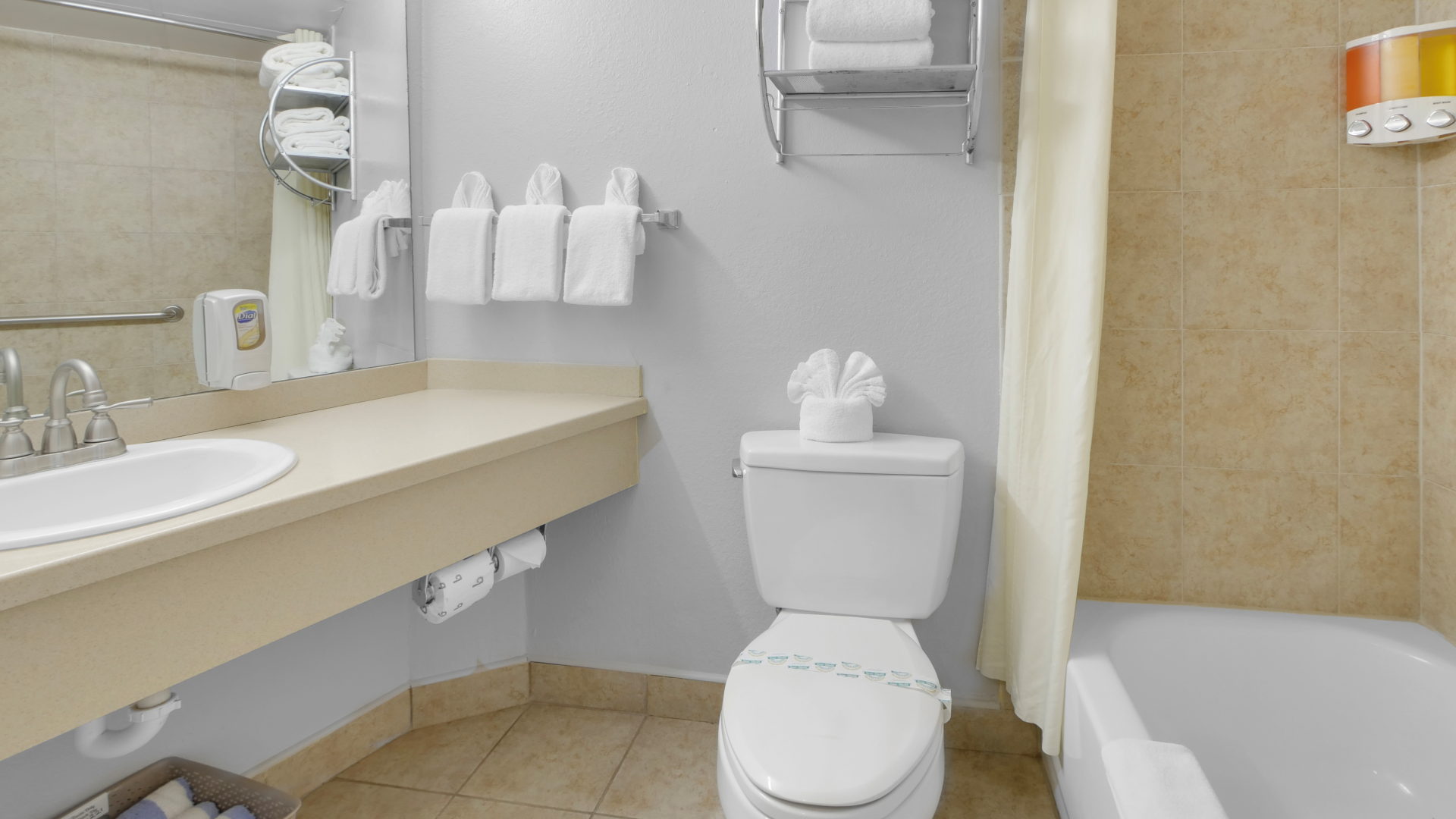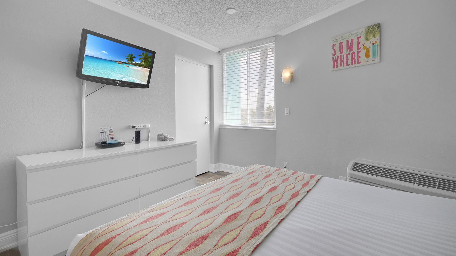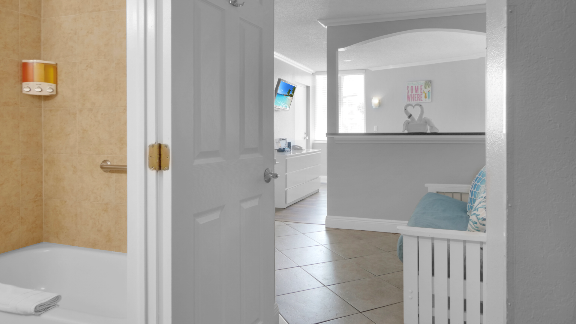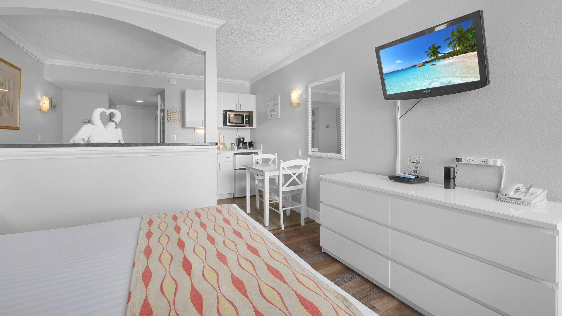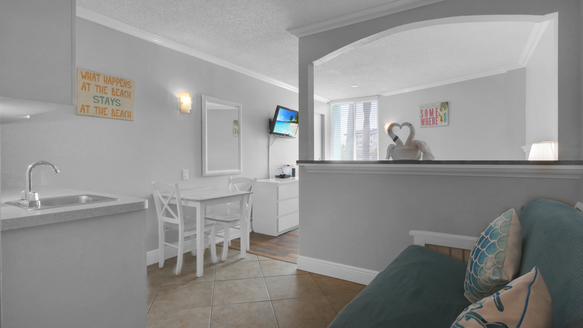 Nestled in the corner behind the elevator, this Studio offers a little extra privacy and a quieter stay compared to poolside rooms, while still keeping you just steps from the sugar-white sands of Clearwater Beach. Inside, you'll find a convenient kitchenette with a mini-fridge, microwave, coffee maker, and toaster - perfect for preparing light meals and snacks. A dining table with two chairs and a flat-screen TV create a comfortable space to dine or unwind, while the private bathroom is stocked with fresh towels and toiletries. The perfect place to relax after a day in the sun!