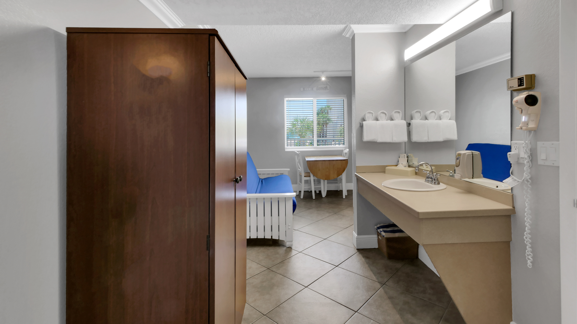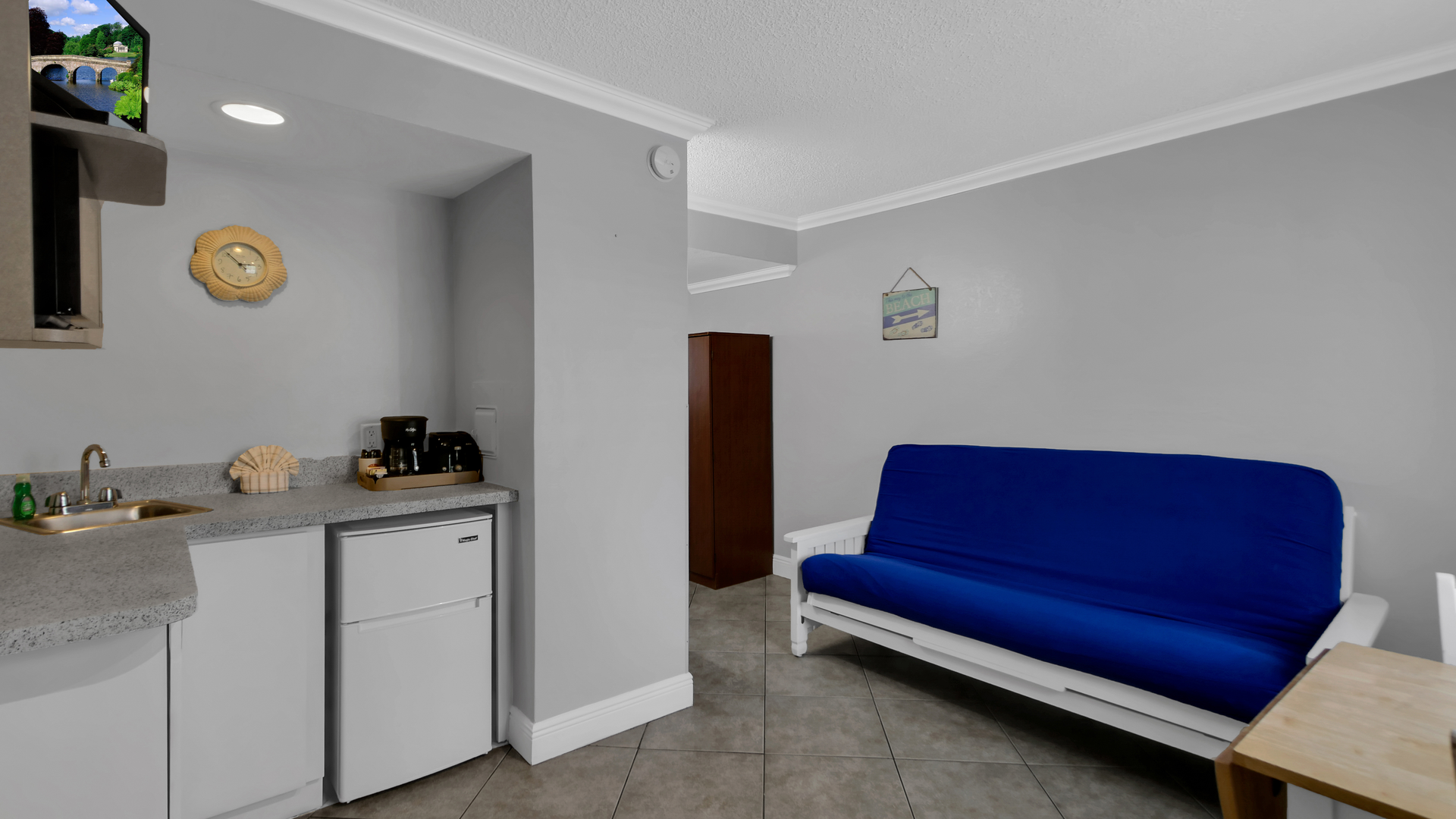 The suite features a welcoming front living area with dining space and a futon, along with a convenient kitchenette featuring a mini-fridge, microwave, coffee maker, and toaster - perfect for preparing light meals and snacks. A flat-screen TV adds extra comfort for downtime, while the private bathroom is stocked with fresh towels and toiletries. The perfect place to relax after a day in the sun!
