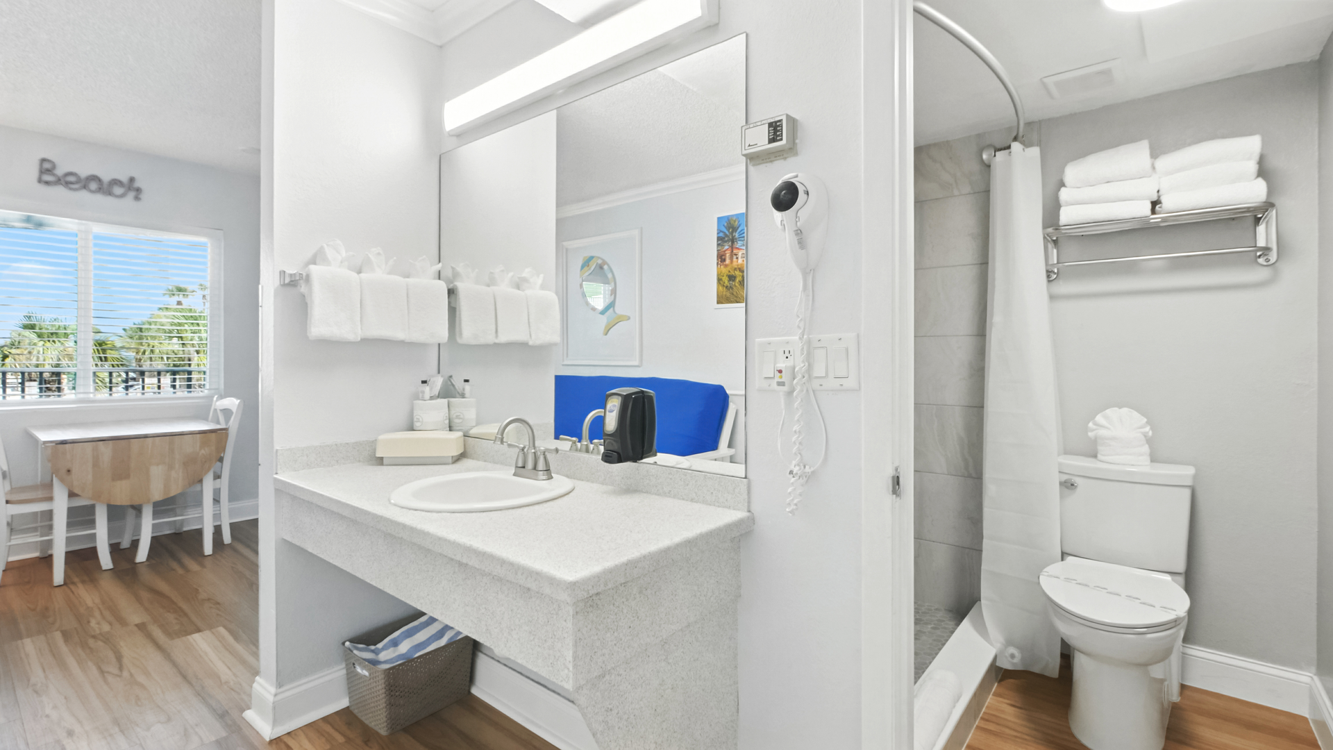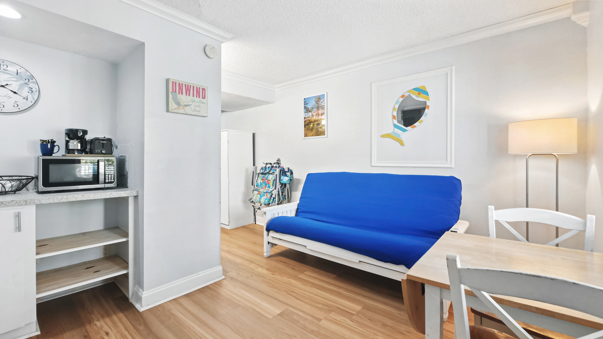 The suite features a welcoming front living area with dining space and a futon, along with a kitchenette equipped with a full-size refrigerator, microwave, coffee maker, and toaster - perfect for preparing light meals and snacks. A flat-screen TV adds extra comfort for downtime, while the private bathroom boasts a modern walk-in shower stocked with fresh towels and toiletries. The perfect place to relax after a day in the sun!