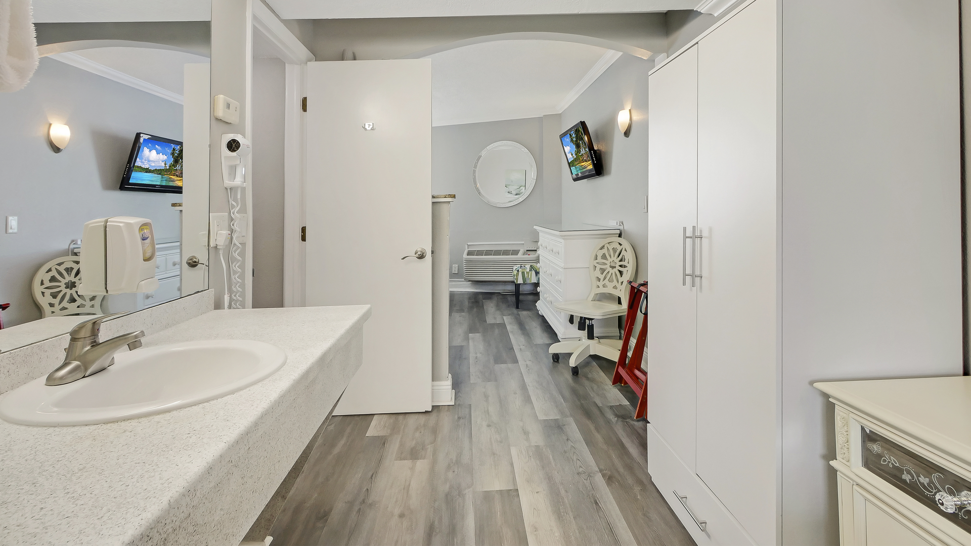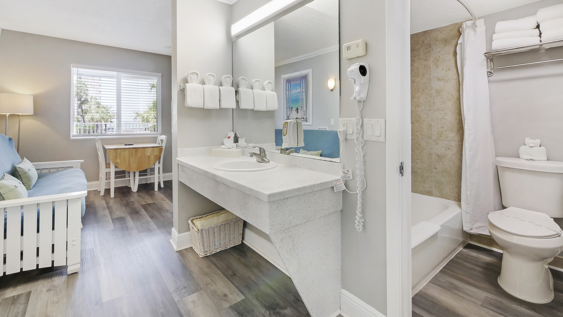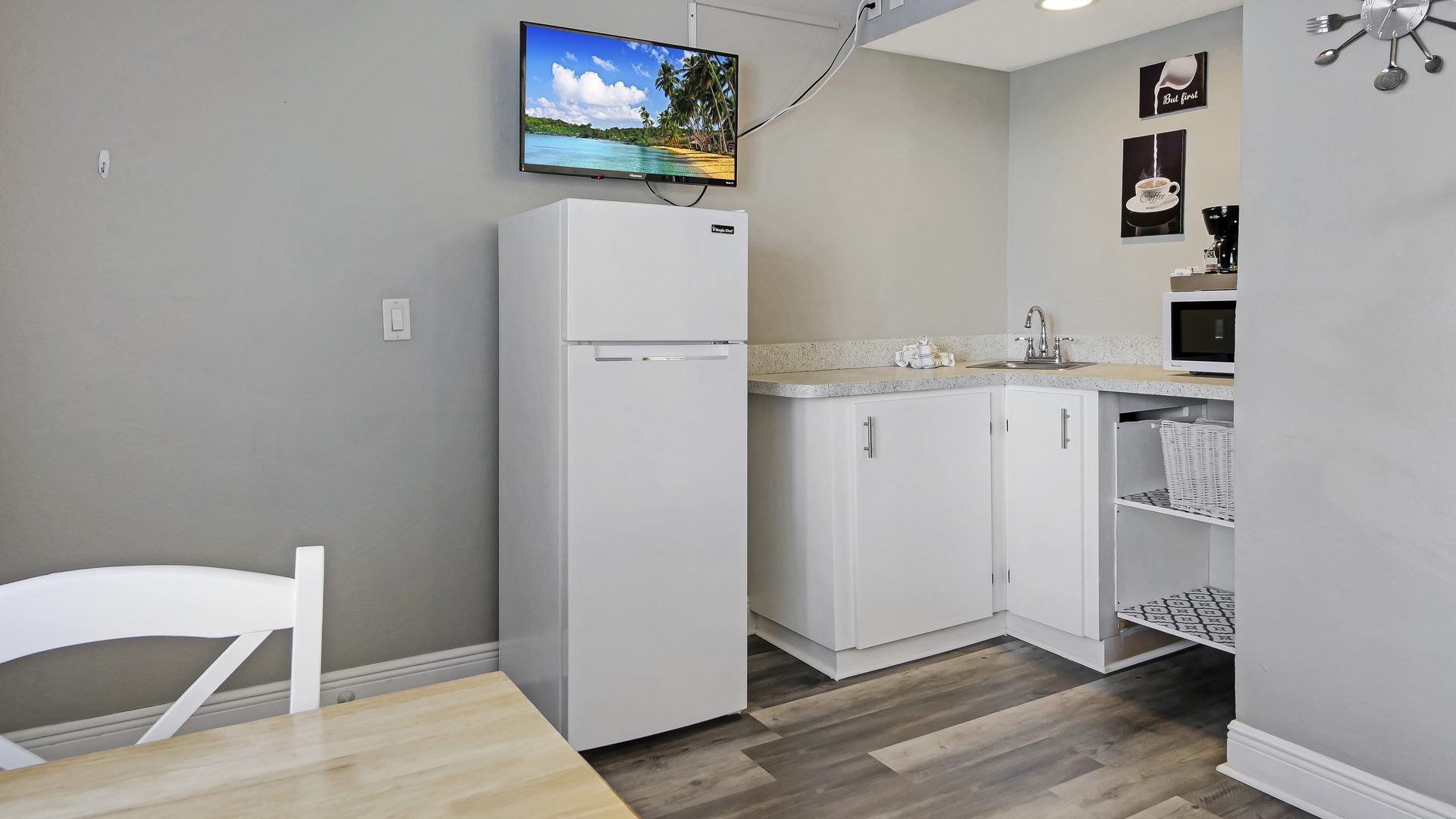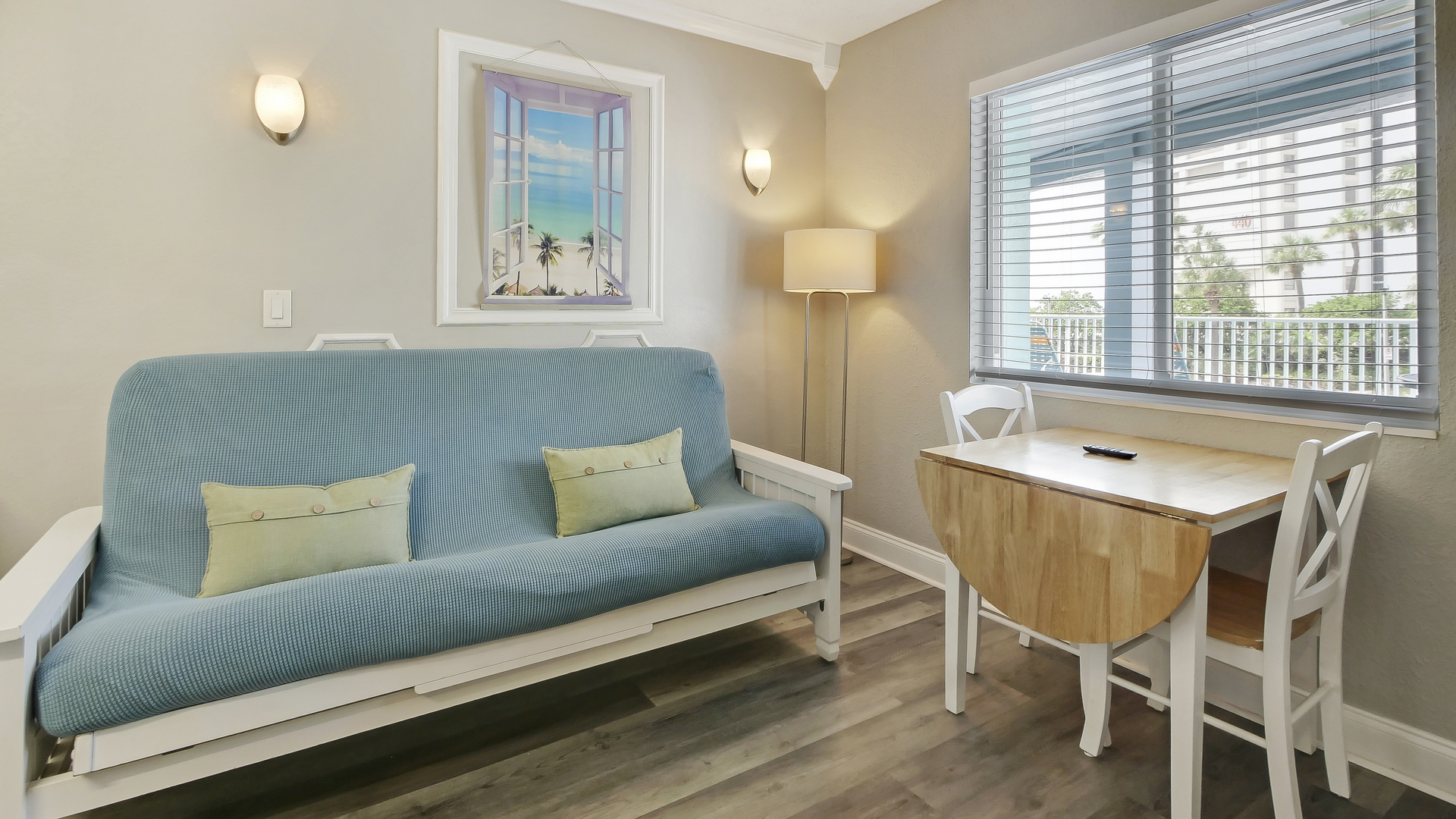 Inside, the suite features refreshed finishes for a modern touch, along with a comfortable front living area with dining space and futon. The kitchenette is equipped with a full-size refrigerator, microwave, coffee maker, and toaster - perfect for preparing light meals and snacks. A flat-screen TV adds extra comfort for downtime, while the private bathroom is stocked with fresh towels and toiletries. The perfect place to relax after a day in the sun!