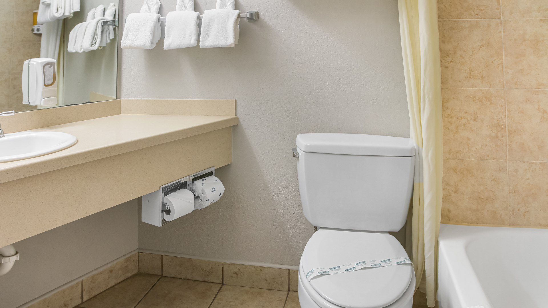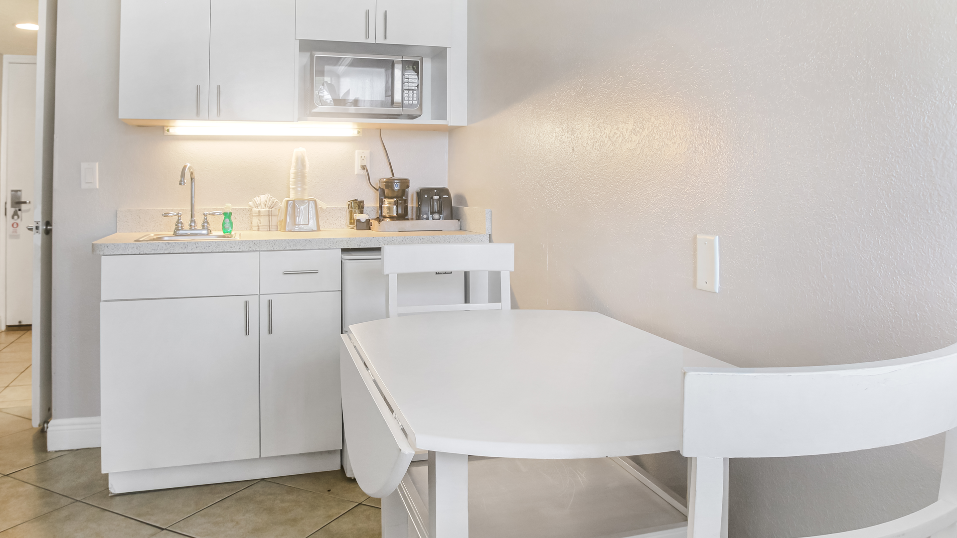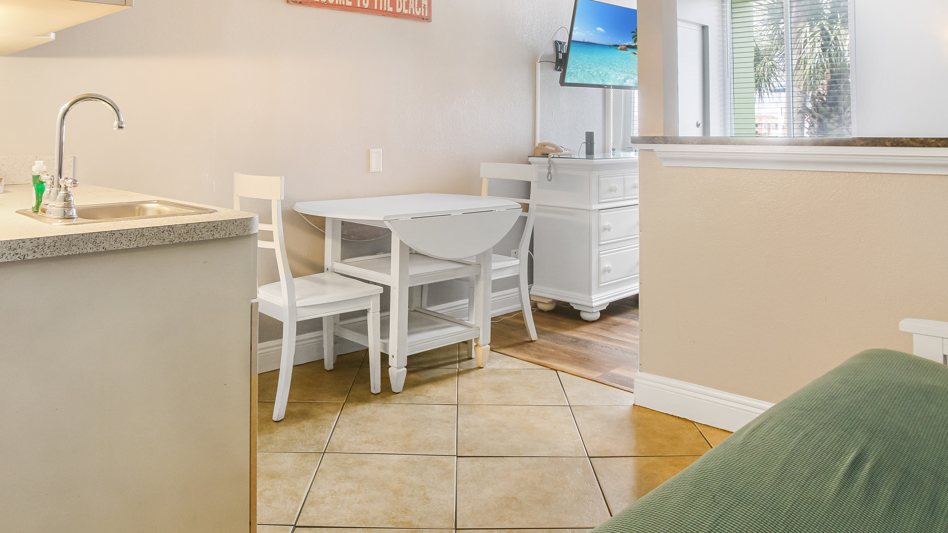 Nestled in the corner behind the elevator, this Studio offers a little extra privacy and a quieter stay compared to poolside rooms, while still keeping you just steps from the sugar-white sands of Clearwater Beach. Inside, you'll find a convenient kitchenette with a mini-fridge, microwave, coffee maker, and toaster - perfect for preparing light meals and snacks. A dining table with two chairs and a flat-screen TV create a comfortable space to dine or unwind, while the private bathroom is stocked with fresh towels and toiletries. The perfect place to relax after a day in the sun!