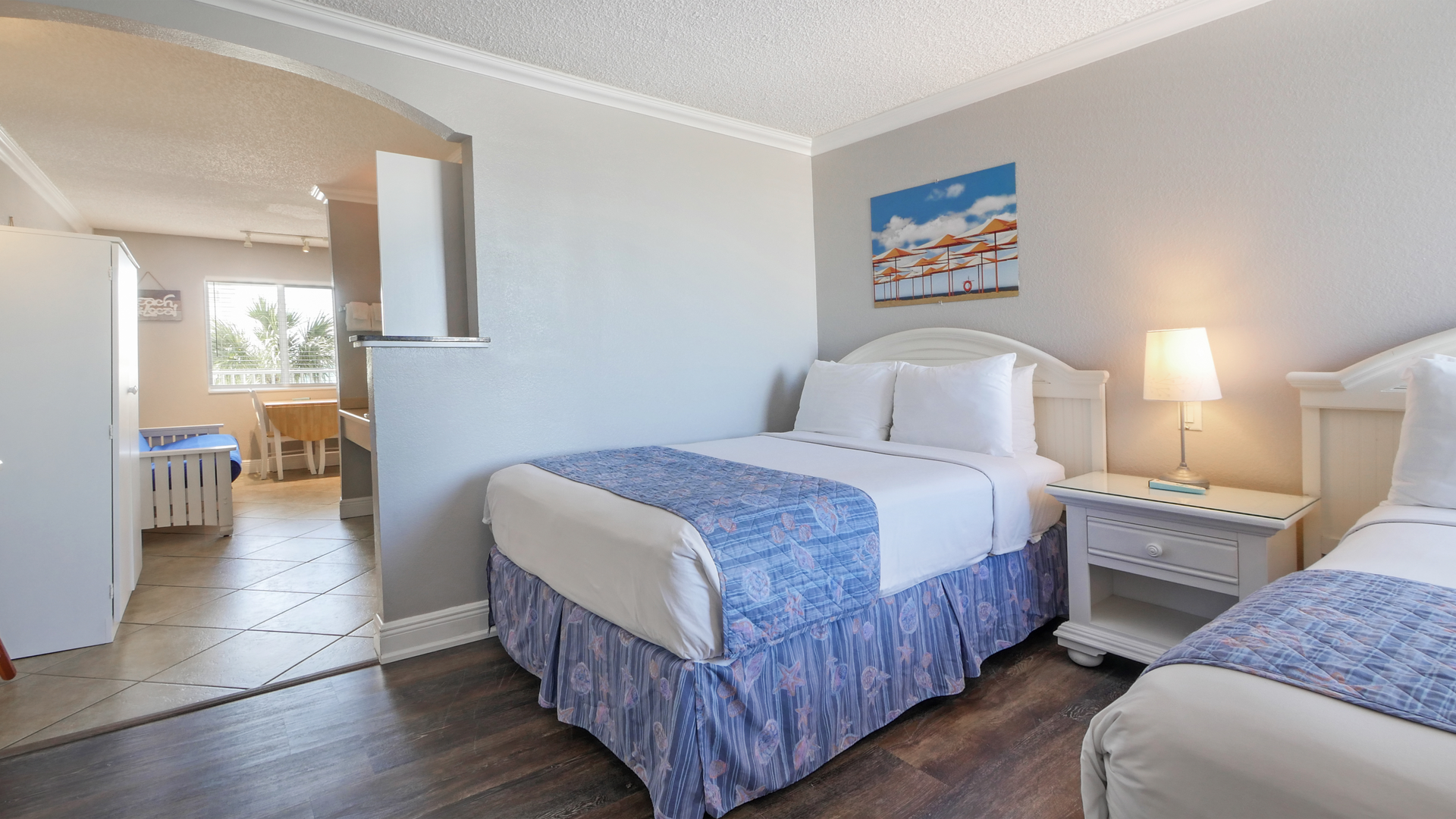 This spacious 3rd-floor Double Suite overlooks the pool and features a partial Gulf view. Perfect for families or groups, it sleeps up to 6 with two full-size beds and a full-size sleeper futon.