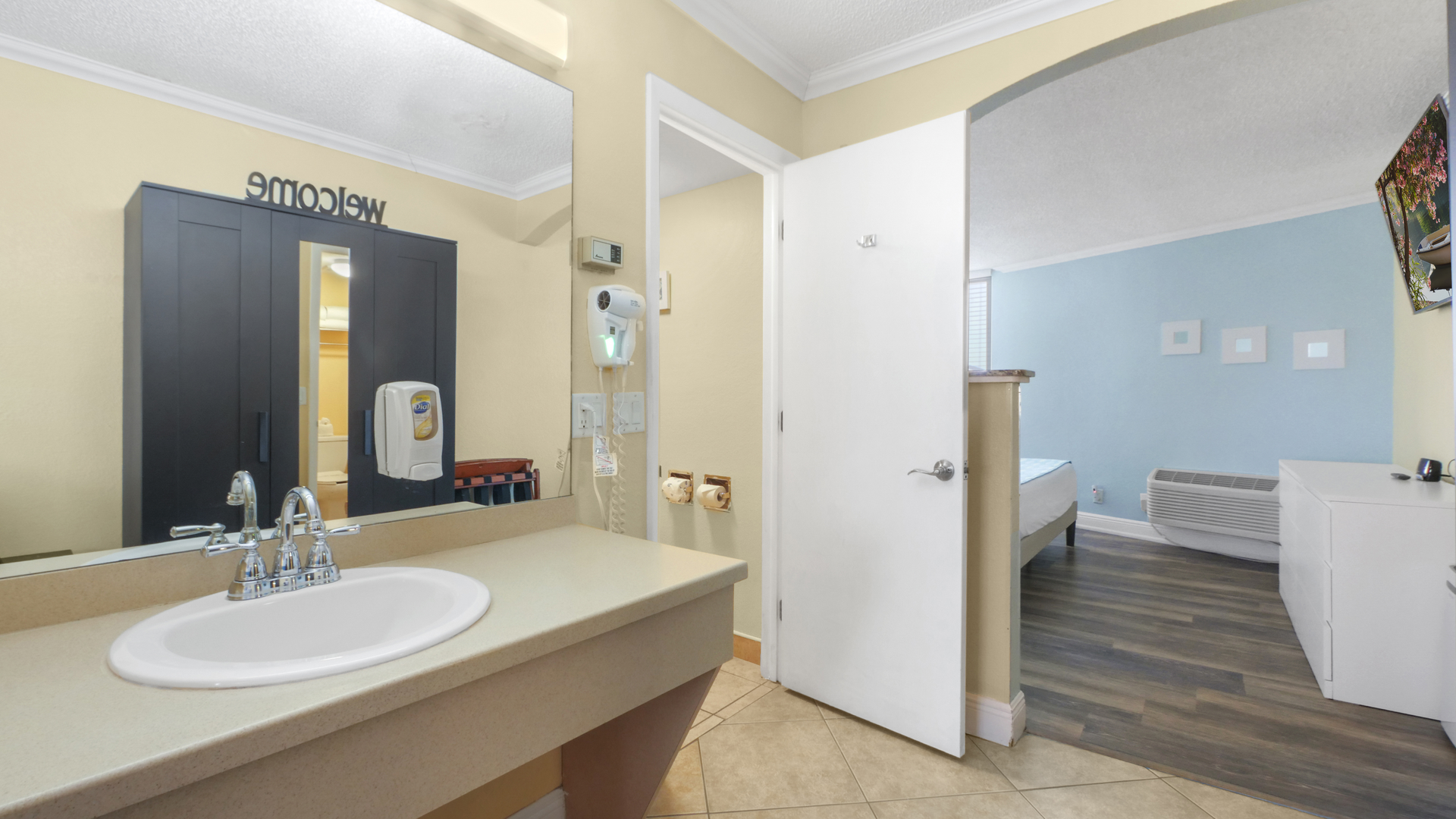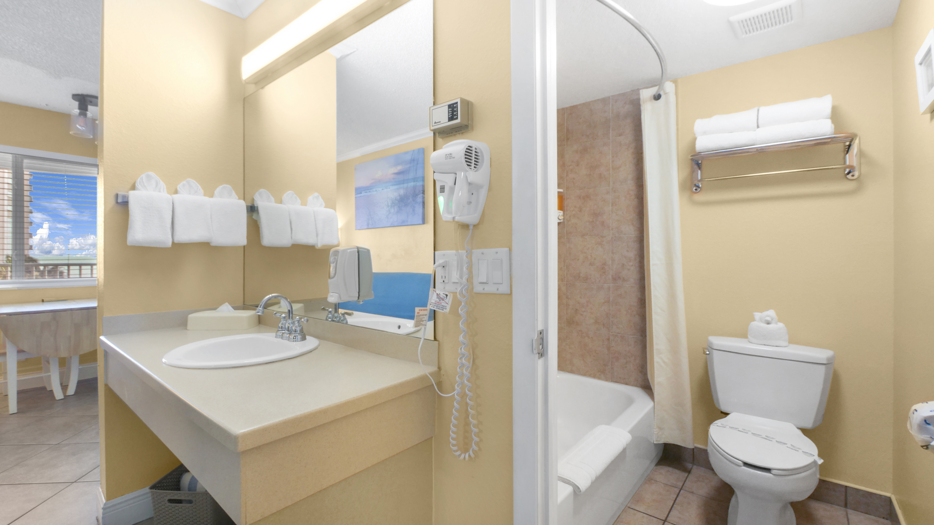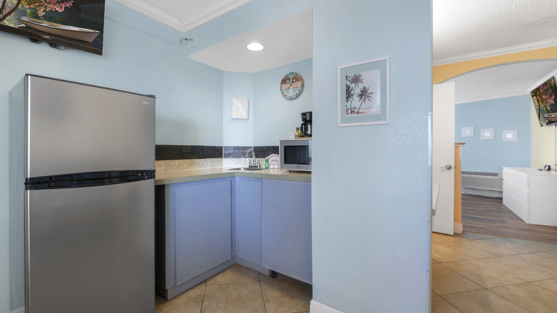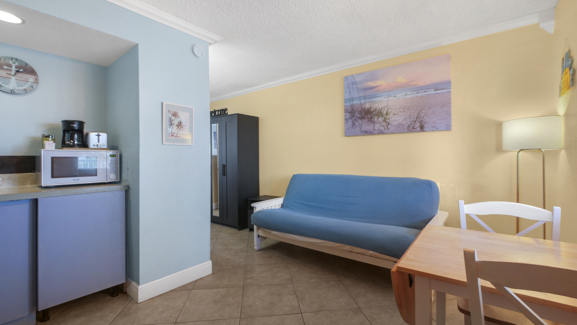 The suite features a welcoming front living area with dining space and a futon, along with a convenient kitchenette featuring a full-size refrigerator, microwave, coffee maker, and toaster - perfect for preparing light meals and snacks. A flat-screen TV adds extra comfort for downtime, while the private bathroom is stocked with fresh towels and toiletries. The perfect place to relax after a day in the sun!