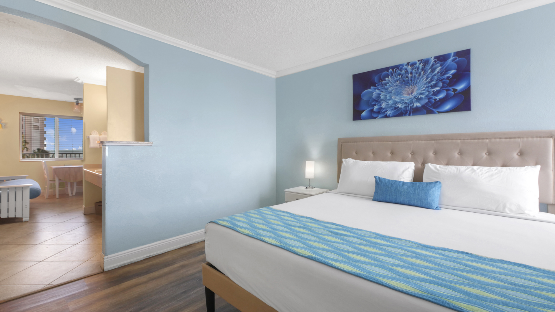 This spacious 4th floor King Suite overlooks the pool and features a partial Gulf view. Perfect for couples or small families, it sleeps up to 4 with one king bed and a full-size sleeper futon.