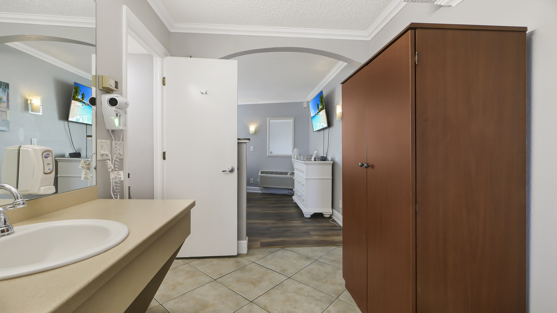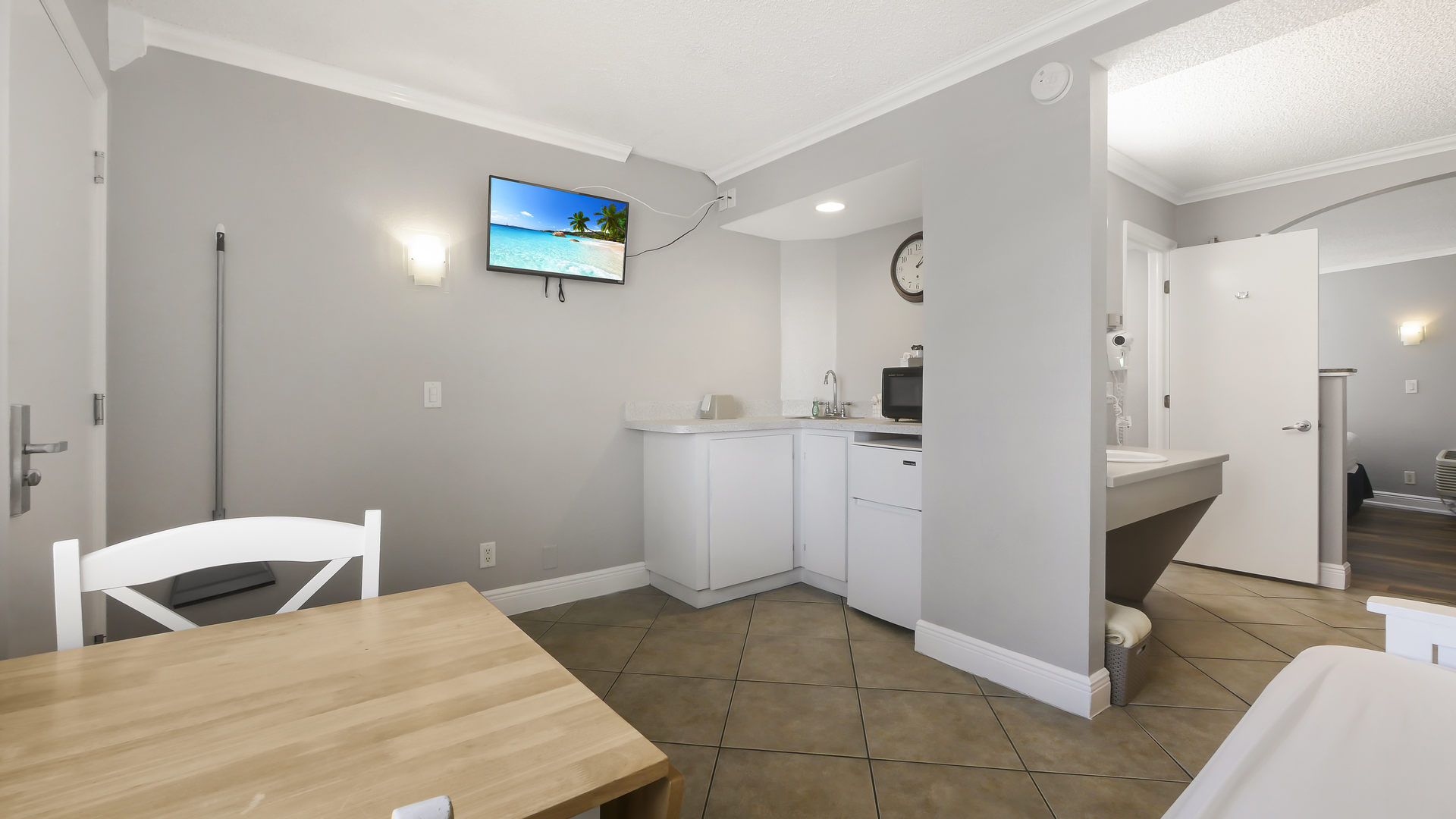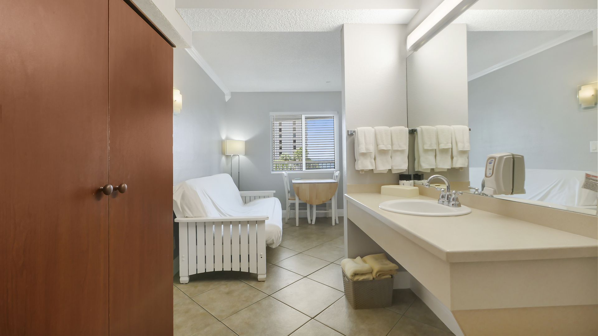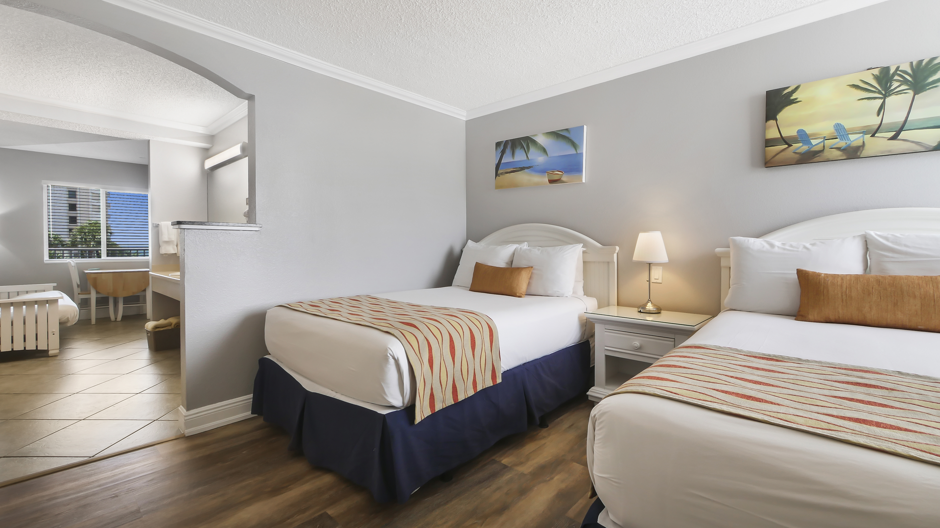 The suite features a welcoming front living area with dining space and a futon, along with a convenient kitchenette featuring a mini-fridge, microwave, coffee maker, and toaster - perfect for preparing light meals and snacks. A flat-screen TV adds extra comfort for downtime, while the private bathroom is stocked with fresh towels and toiletries. The perfect place to relax after a day in the sun!